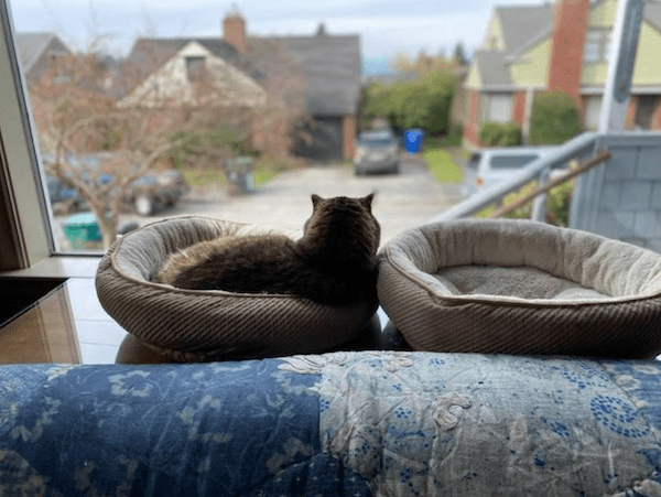 When Justin’s mom decided to retire to Edmonds and sell their house, they realized not only that Max would be disoriented by the move, but that Edmonds prohibited outdoor cats. Thus, Max moved into our house on a permanent basis, taking up residence in a cat bed in the front window where he could easily keep an eye on the neighborhood.