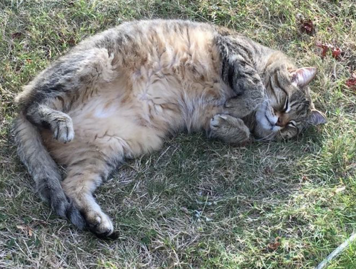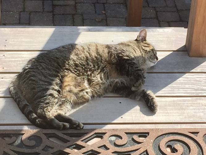 August 29, 2019—The UPS guy scared off the other cats, so make has the front lawn to himself. Which is how he likes it: