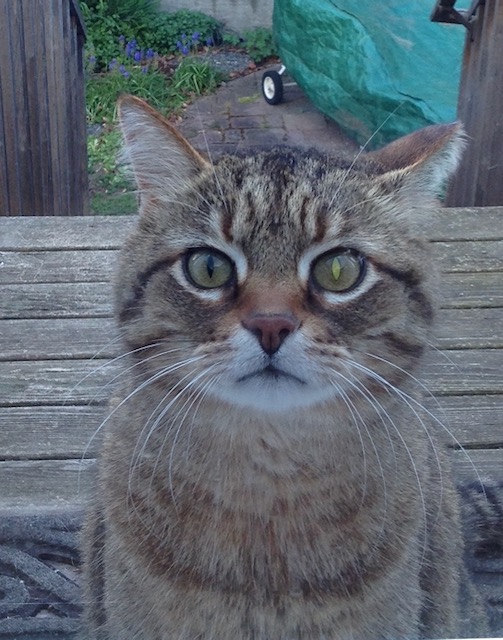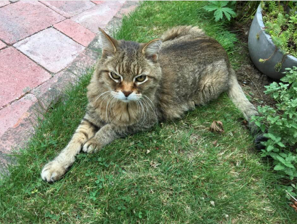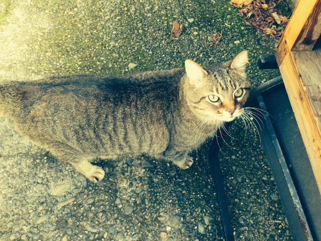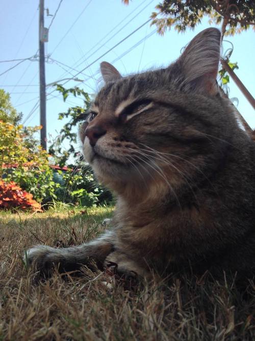 One day we realized that this huge caramel tabby, who looked a bit like a wild Pallas cat, expected to come into our house, nap in our cats’ beds, eat our cats’ cat food, and add our house to the several houses in the neighborhood that he visited on his daily patrol. He had a house where he usually slept at night, but he spent most of his time sitting on their front lawn, waiting for someone to walk out a door or pull up in a car so he could greet them.