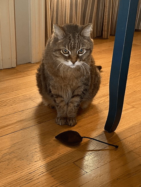 Dec. 1, 2020—Max is guarding his giant new catnip mouse made by Ocheltree Design (an Etsy shop). Their mice are made from soft, thick re-purposed suede and stuffed with fresh catnip. If your cat manages to open one, they will replace it!