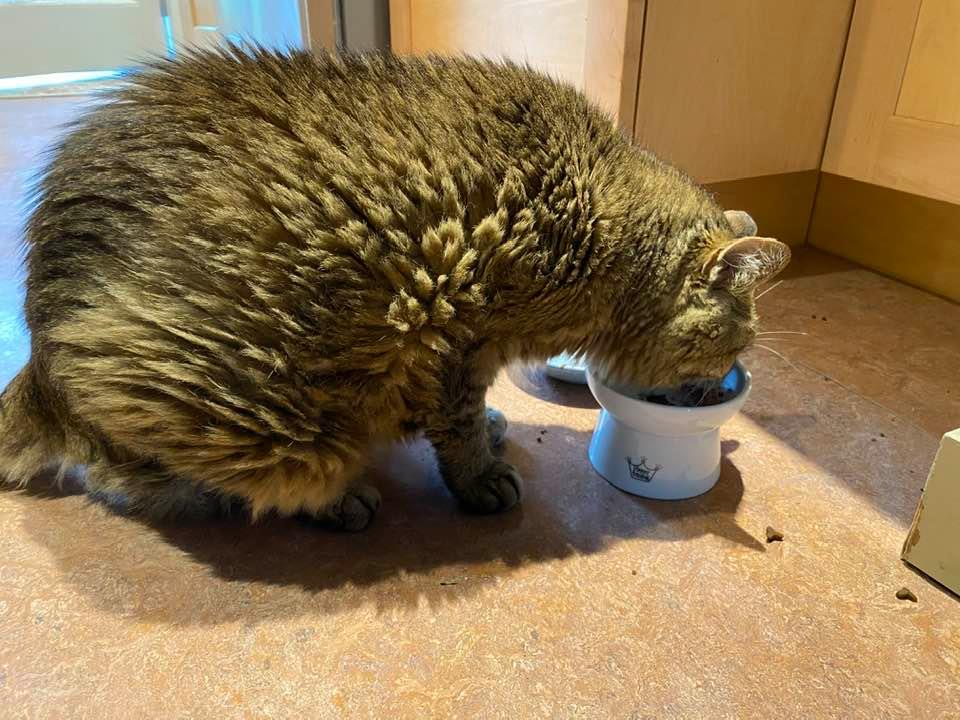 August 21, 2020—Max likes his new elevated dish for wet food (by Necoichi). He doesn’t push food on the floor anymore. And the raised water bowl is great, too. Zoe also got raised bowls — they both have some arthritis issues.