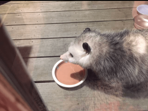 The week before the 2016 presidential elections, two possums turned up on the back porch for the cats’ food and water. One was big, scruffy, and orange. The other was elegant and black and white. The orange guy vanished the night of the election and was never seen again. The black and white female, who we’d named “Rubia,” was with us for two years. We put food out for her every night. Here’s Rubia in 2017: